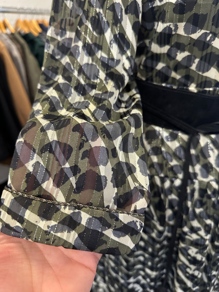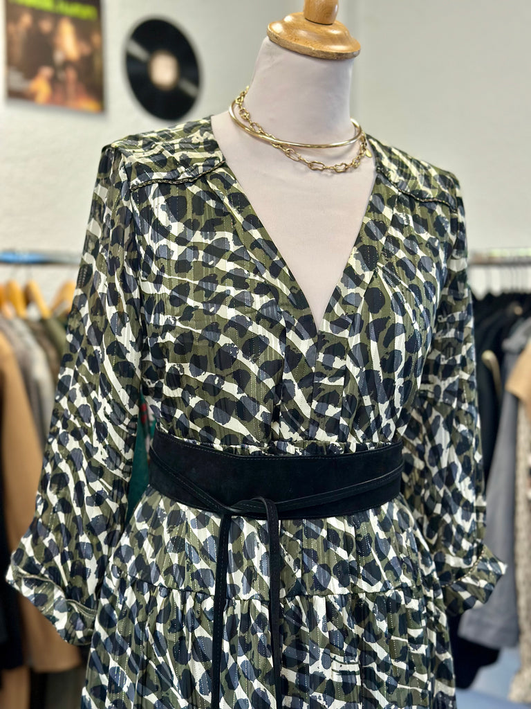 Robe imprimé kaki et noir. Coupe ample, manches en voile et col V. Doublure.