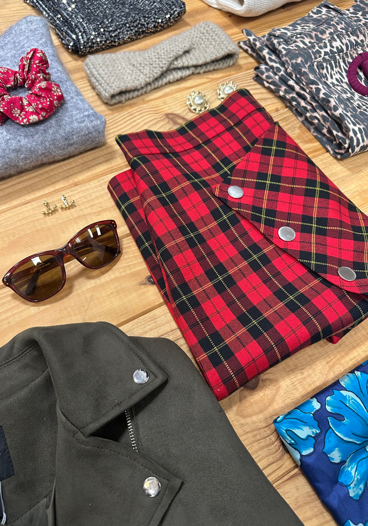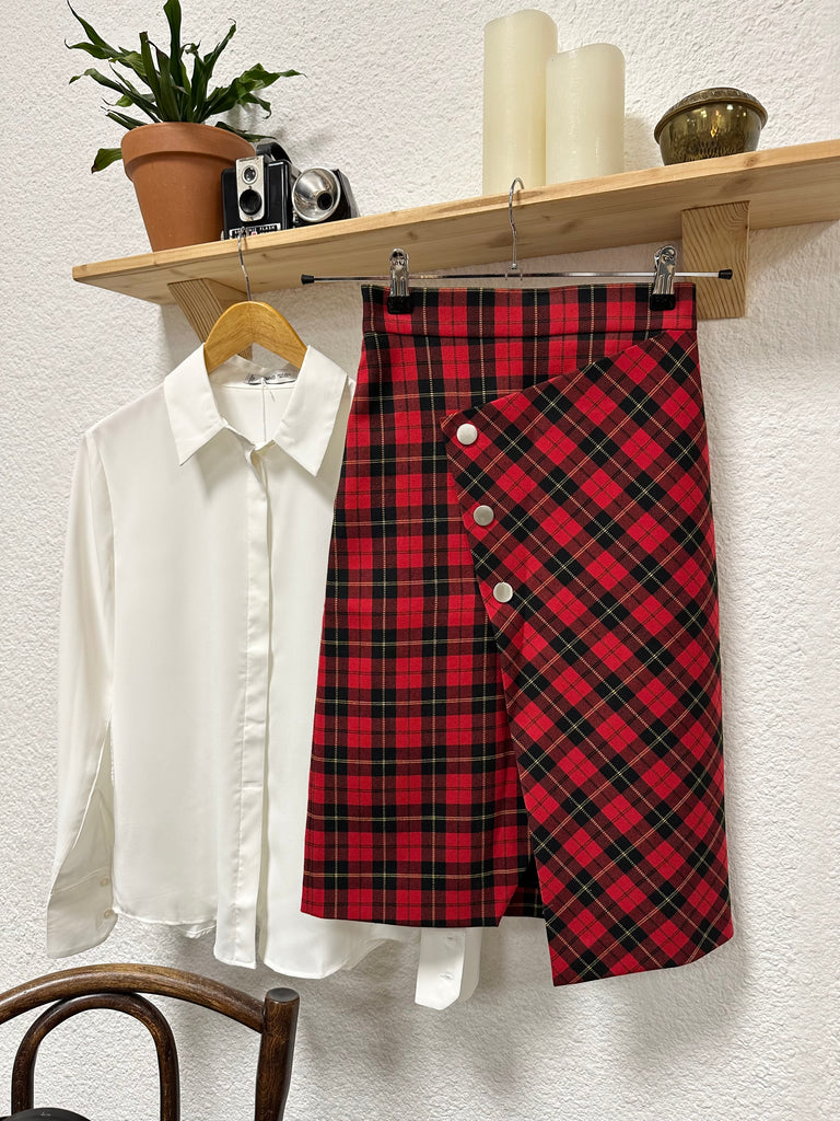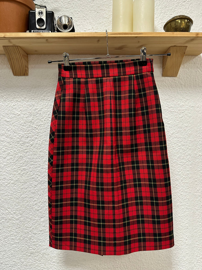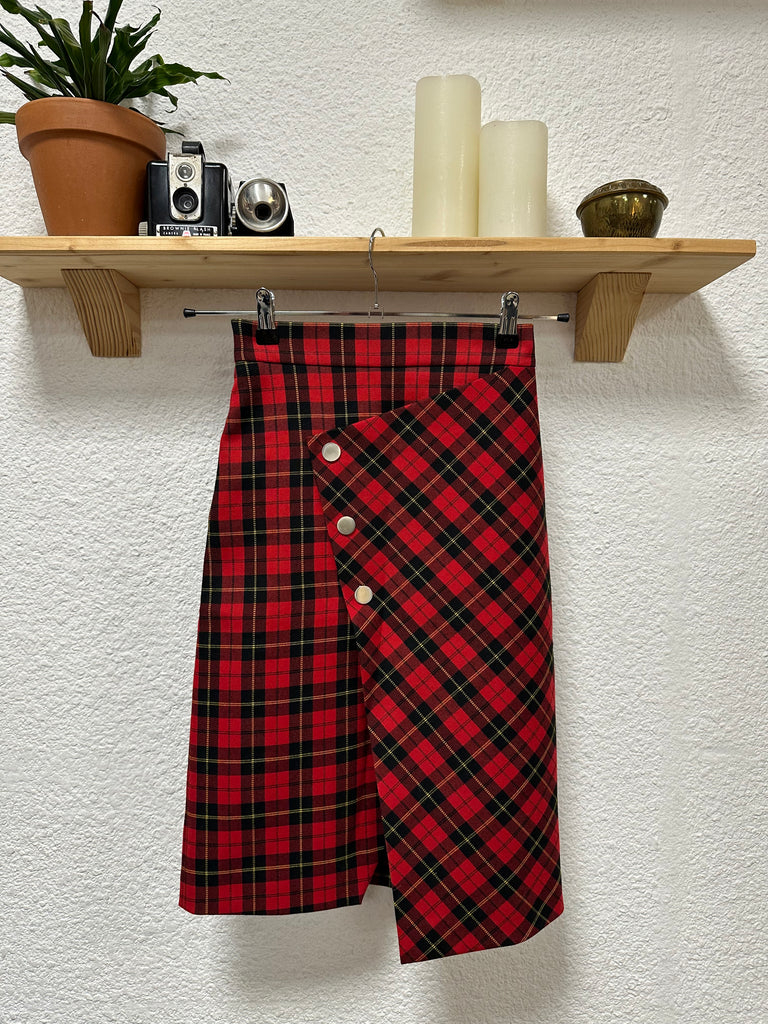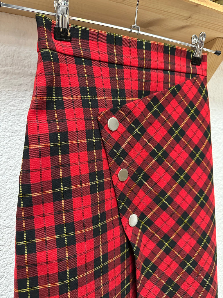 Jupe écossaise rouge, coupe moulante et droite. Fendu sur l’avant avec boutons pressions