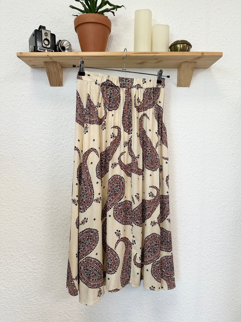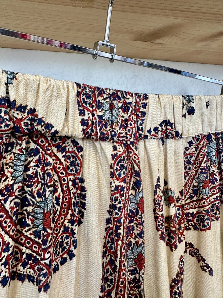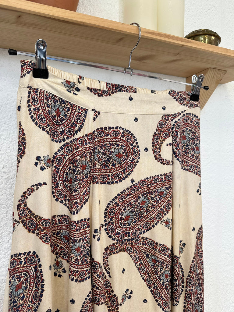 Jupe longue beige imprimé. Taille élastique au dos. Coupe évasé.