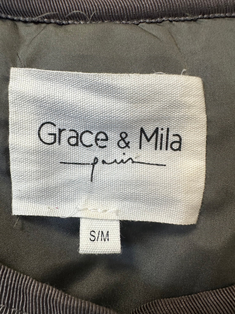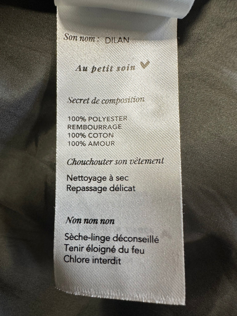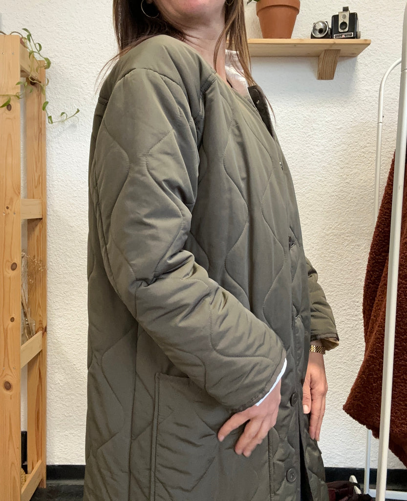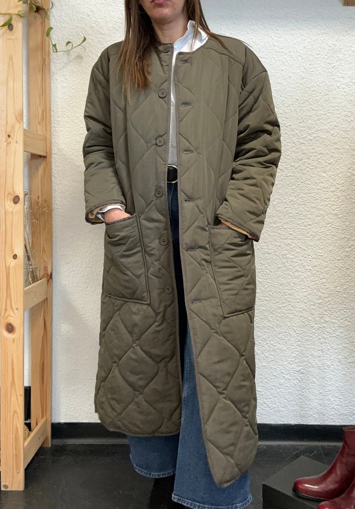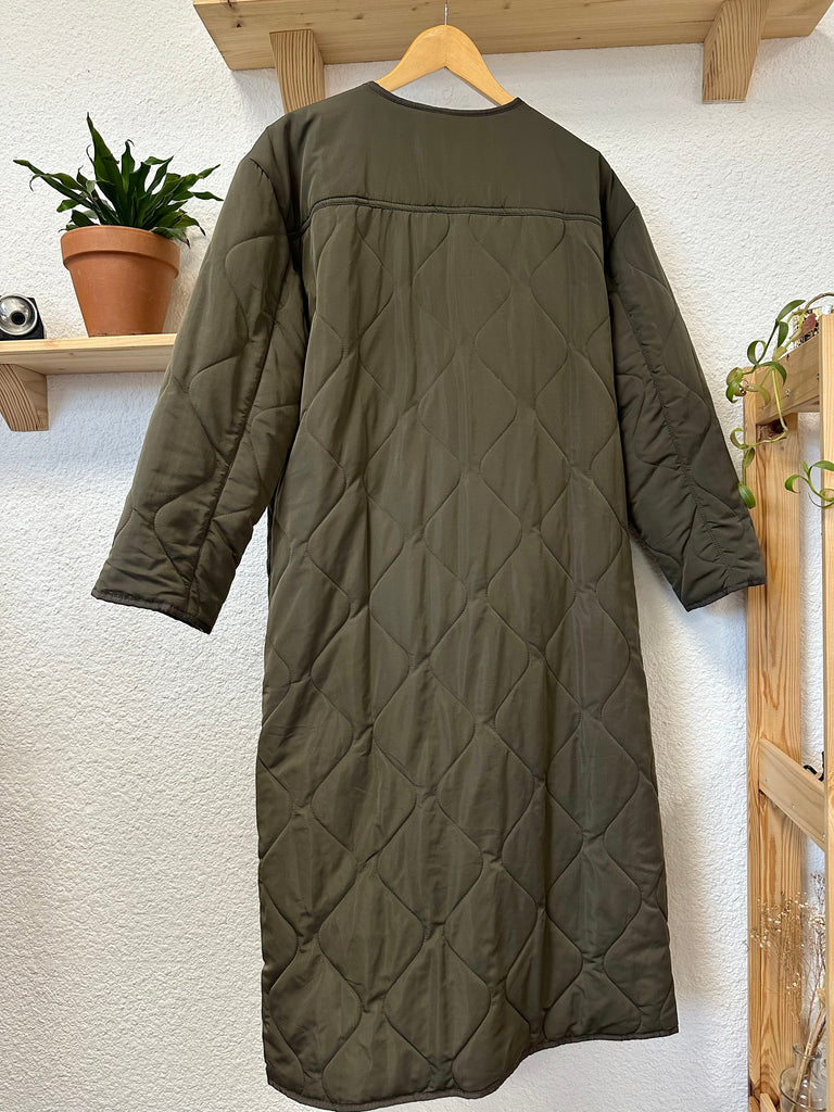 Manteau long matelassé kaki. Coupe confotable. 2 poches et fermeture boutons
