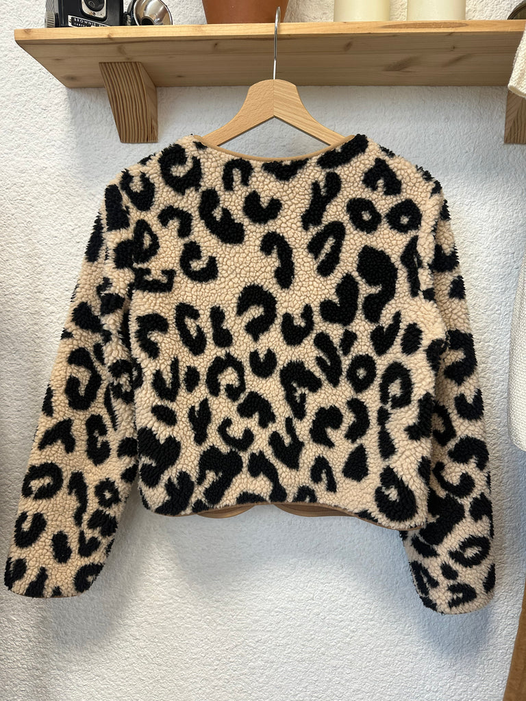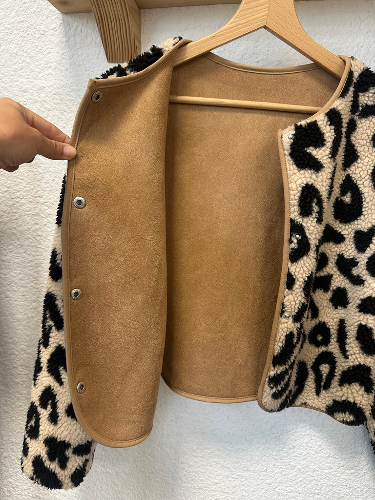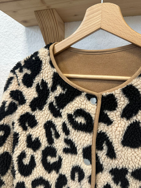 Veste moumoute imprimé animal. Coupe courte. fermeture boutons pressions